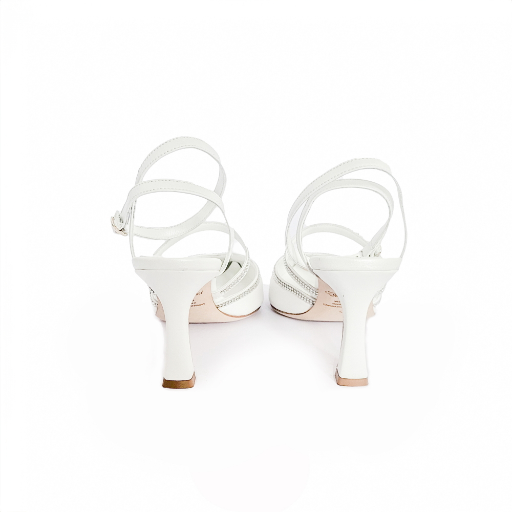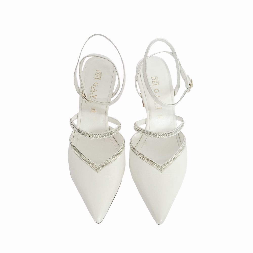 Questa calzatura è stata realizzata interamente a mano, in bianco seta con cristalli color platino , è possibile in alternativa averli color cristal.